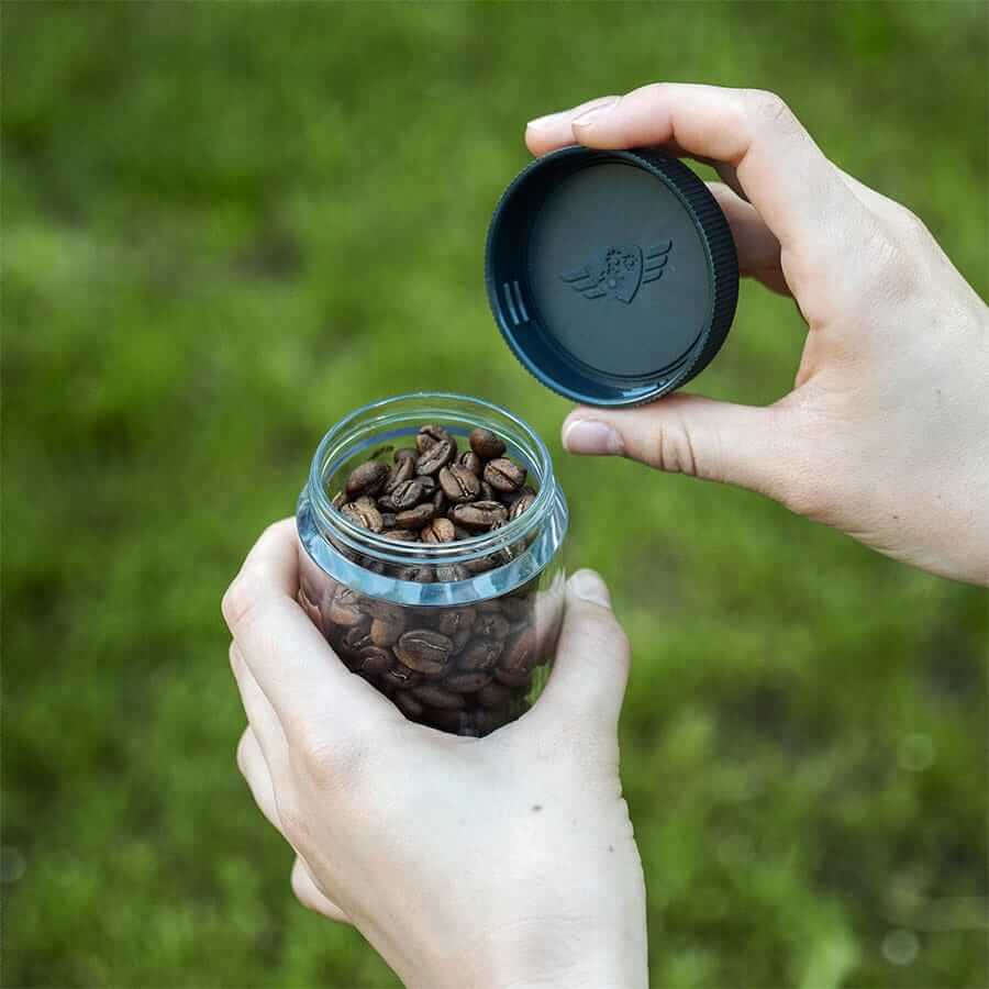 Ligero y prácticamente irrompible, el tarro para café de Comandante es la solución perfecta para viajar, almacenar café e incluso beber, sus gruesas paredes aíslan el calor.