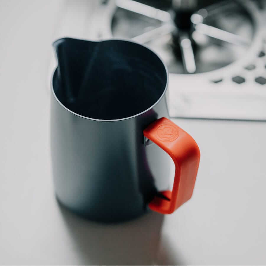 Las fundas de asa de silicona para jarras de Rhino Coffee Gear están disponibles en varios colores y han sido diseñados para adaptarse perfectamente a las jarras de Rhino Coffee Gear.